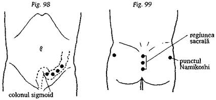 Shiatsu. Din pozitia culcat pe spate pe podea, aplicati presiunea shiatsu mai intai asupra punctelor situate pe abdomen (vezi pag. 112 - fig. 1). In continuare, tratati colonul sigmoid, care, la cei ce sufera de constipatie, aproape intotdeauna este dur. Cele patru puncte pentru colonul sigmoid se afla situate pe o linie descendenta, oblica, in partea stanga, mai jos de buric, ajungand pana in regiunea din apropierea rectului (fig. 98). Flexibilizati colonul exercitand presiunea asupra fiecarui punct, incet, cu palma mainii drepte, deasupra careia puneti palma mainii stangi.