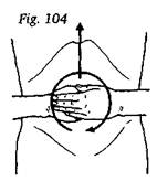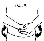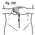 Stretching. Puneti o mana peste cealalta, aliniindu-le pe orizontala, iar palma celei de dedesubt o asezati pe ombilic, dupa care efectuati o miscare de vibratie patrunzatoare timp de zece secunde. Repetati de trei ori. Apoi, exercitati o presiune circulara cu palma in directia acelor ceasornicului; fiecare apasare va dura zece secunde (fig. 104). Punand o mana peste cealalta, asezati-le pe stomac, deasupra ombilicului, si trageti-le in sus, cu o miscare de intindere (fig. 105). Mentineti pozitia zece secunde; repetati aceasta presiune aspiratorie de trei ori.