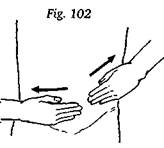 trei ori. In continuare, urmand linia punctelor shiatsu, trageti colonul sigmoid simultan spre stanga si spre dreapta (fig. 102). Mentineti fiecare pozitie timp de zece secunde; repetati de trei ori.
