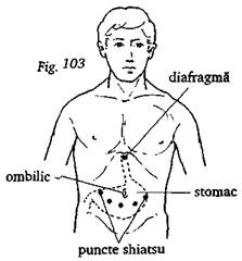 Shiatsu. Culcati-va pe podea cu fata in sus, tinand picioarele intinse. Efectuati un tratament shiatsu viguros asupra intregii regiuni abdominale, cu palmele, precum si cu indexul, degetul mijlociu si inelarul ambelor maini. Dupa ce tensiunea s-a atenuat intr-o anumita masura, continuati cu partea inferioara a abdomenului, situata chiar deasupra stomacului, si aplicati presiunea shiatsu asupra tuturor punctelor din aceasta zona (fig. 103). Repetati de cateva ori.