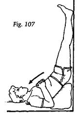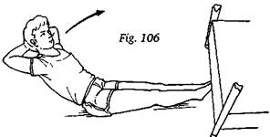 Pentru a fortifica muschii abdominali, fixati degetele de la picioare sub o canapea sau sub o alta mobila potrivita si impreunati degetele ambelor maini, ducand palmele la ceafa. Apoi, ridicati trunchiul si mentineti aceasta pozitie timp de zece secunde (fig. 106). Reveniti in pozitia initiala; repetati de trei ori.