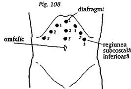Shiatsu. Mai intai veti flexibiliza zona dintre diafragma (care va fi dura in acest caz) si portiunea de deasupra ombilicului, apasand cu palma cele trei puncte din sirul vertical (fig. 108), apoi repetand presiunea cu indexul, degetul mijlociu si inelarul (fig. 108).