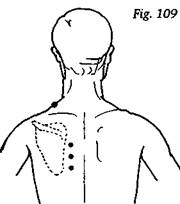 Trebuie sa insistati cu tratamentul shiatsu asupra punctului stang suprascapular si a celor trei puncte interscapulare stangi, deoarece ele reprezinta locurile unde apar de cele mai multe ori reflexele legate de stomac (fig. 109).