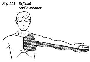 Dereglarile in functionarea inimii se manifesta mai ales sub forma de palpitatii, gafaieli si o senzatie de apasare in partea stanga a pieptului. Aceste simptome sunt insotite de dureri surde si de o senzatie de amorteala ce se transmit intr-o regiune situata intre umarul stang, apoi prin brat, de la axila pana la degetul mic (fig. 111). Prin aplicarea presiunii shiatsu asupra acestei regiuni, unde apar reflexele provenite de la inima, se trimit reflexe de reglare inapoi la inima.