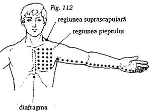 Shiatsu. Tratamentul shiatsu, efectuat asupra punctelor din zona corespunzatoare, incepe prin presiuni cu indexul, mijlociul si inelarul in regiunea suprascapulara (fig. 112).