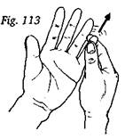 Stretching. Stati in picioare, cu bratul stang intins inainte. Apucati varful degetului mic stang cu indexul si cu degetul mare ale mainii drepte, apoi trageti degetul mic, printr-o miscare de intindere, facand sa vibreze incetisor tot bratul stang, timp de zece secunde (fig. 113). Repetati de trei ori.