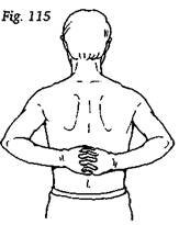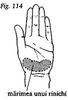 Shiatsu. Rinichiul omului are marimea regiunilor carpiene, tenare si hipote-nare ale mainii reunite (fig. 114). Impreunata degetele ambelor maini la spate, de ambele parti ale coloanei, in asa fel incat regiunile carpiene sa fie lipite