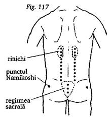 dureze trei secunde. Repetati de trei ori. Dupa aceea, cu varfurile ambelor degete mari, apasati fiecare din cele trei puncte din regiunea sacrala. Fiecare presiune dureaza trei secunde. Repetati de trei ori. Apoi, apasati cu degetele mari, simultan, punctele Namikoshi. Fiecare presiune va fi puternica si va dura cinci secunde. Repetati de trei ori.