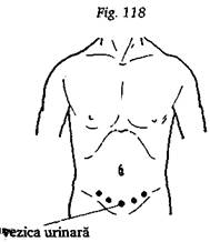 Urmatorul tratament shiatsu se aplica pe abdomen, in regiunea vezicii urinare. Culcati-va cu fata in sus si, punand o mana peste cealalta, apasati cu palma de jos punctul de pe vezica situat pe linia mediana, sub ombilic (fig. 118). Fiecare presiune va dura cinci secunde. Repetati de trei ori.