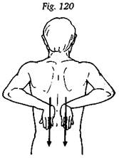 Apoi, cu varfurile indexului, degetului mijlociu si inelarului ambelor maini, apasati punctul situat pe vezica urinara, in asa fel incat degetele sa se atinga. Apasati si cele doua siruri alcatuite din cate doua puncte situate pe ambele parti ale vezicii urinare cu indexul, mijlociul si inelarul fiecarei maini. Presiunea va fi exercitata simultan asupra punctelor din stanga si din dreapta. Fiecare apasare va dura trei secunde. Repetati de trei ori. In final, punand o mana peste cealalta, faceti sa vibreze punctul de pe vezica urinara timp de zece secunde. Repetati de trei ori. Stretching. Mai intai, impreunati degetele ambelor maini la spate si apasati regiunea carpiana pe zona varfurilor de sus ale ambilor rinichi. Apoi, cu o presiune aspiratorie, trageti mainile in jos (fig. 119). Continuati sa apasati timp de zece secunde. Repetati de trei ori.