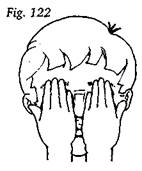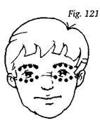 Tratamentul shiatsu se efectueaza in apropierea ochiului (fig. 121). Mai intai aplicati presiunea asupra celor patru puncte din fosa suborbitala. Apasati simultan punctele din stanga si din dreapta, cu indexul, degetul mijlociu si inelarul ambelor maini. Incepeti din coltul interior al ochiului spre cel din afara. Fiecare presiune va dura trei secunde. Repetati de trei ori. Apoi, efectuati aceeasi terapie asupra celor patru puncte din fosa supraorbitala (fig. 121 si 122).