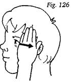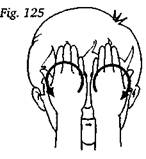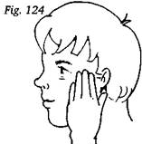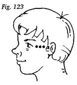Cu o miscare de tragere, pornind de la coltul exterior al ochiului spre ureche, efectuati simultan tratamentul shiatsu asupra celor trei puncte temporale situate de-o parte si de alta a capului (figurile 123 si 124). Fiecare aplicatie dureaza trei secunde. Repetati de trei ori.
