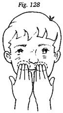 Cu grija, pentru a nu exercita presiunea direct asupra globilor oculari, puneti cate o palma pe fiecare ochi si executati simultan o rotatie (stretching circular) spre exterior (fig. 125). Fiecare rotatie trebuie sa dureze o secunda; repetati de zece ori. Apoi, puneti palmele pe tample si trageti-le simultan in directia urechilor (fig. 126). Mentineti aceasta pozitie timp de zece secunde. Repetati de trei ori.