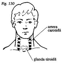 Mai intai, flexibilizati muschii gatului si stimulati circulatia sanguina prin artera carotida, precum si functionarea glandei tiroide, prin executarea unui tratament shiatsu riguros asupra celor doua siruri alcatuite din cate patru puncte din regiunea cervicala anterioara (fig. 130). Tratati mai intai partea stanga, apoi pe cea dreapta.