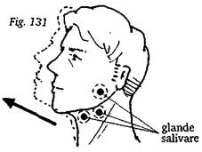 Cu indexul, degetul mijlociu si inelarul ambelor maini, apasati simultan punctele din stanga si din dreapta pentru glandele salivare. Acestea sunt situate mai jos si putin in fata lobilor urechii (fig. 131). Apoi, lasand degetele pe loc, pentru sprijin, apasati simultan cu degetele mari punctele din partea stanga si pe cele din dreapta, situate putin mai sus de primul punct cervical. Exista cate doua puncte de fiecare parte. Repetati de trei ori.