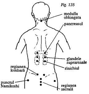 Pentru spate, apasati cu degetele mari punctele din regiunea lombara, cele trei puncte din regiunea sacrala si punctele Namikoshi (fig. 135). In regiunea lombara fiecare presiune va dura cinci secunde. Repetati de trei ori. In regiunea sacrala, presiunea va dura trei secunde. Repetati de trei ori. Punctele Namikoshi vor fi apasate timp de cinci secunde. Repetati de cinci ori.