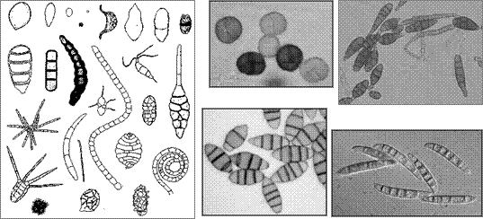 Cea mai comuna forma de înmultire asexuata este cea realizata prin intermediul sporilor. Sporii sunt extrem de variabili din punct de vedere morfologic.