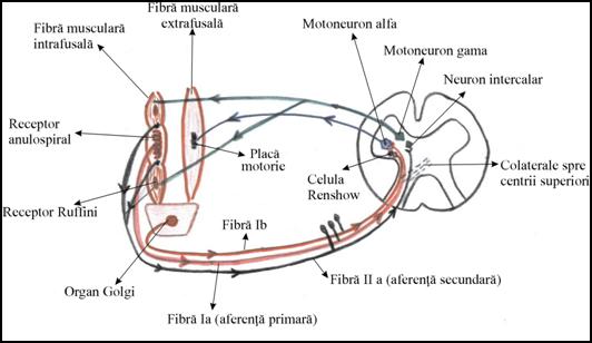 Sistemul Golma - Fibrele musculare intrafusale poseda o inervatie eferenta care provine tot din cornul anterior provocand o contractie la nivelul placii neuro-motorii (extremitatea contractila). Aceasta contractie intrafusala nu are nici o actiune directa asupra lungimii sau tensiunii din muschi dar prin intinderea portiunii centrale a fusului poate astfel provoca impulsuri aferente.