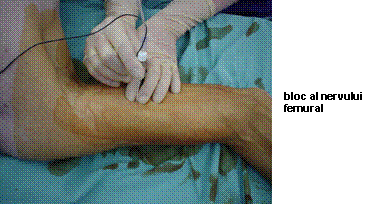 - se incepe cu identificarea nervului femural: se palpeaza artera femurala, la nivelul ligamentului inghinal; acul de anestezie se introduce lateral de artera, la 1,5-2 cm, sub un unghi de 45 (orientat cranial); nervul este interceptat relativ superficial, cu un curent de 1,5 mA; raspunsul motor obtinut va fi reprezentat de ridicarea patelei; se reduce intensitatea curentului, se aspira iar, apoi se injecteaza 20 ml anestezic;