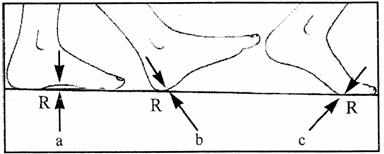Cand sprijinul se realizeaza pe toata suprafata plantara cele doua forte au directie verticala (fig. 3 a), in timp ce in anumite faze ale mersului - atacul cu talonul (fig. 3 b) sau sprijin pe antepicior (fig. 3 c), valorile fortelor reactiva si activa sunt mai mari, deoarece directia lor este oblica.