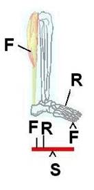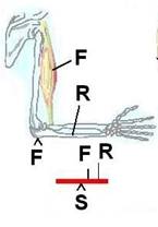 - in general, distanta dintre punctul de aplicatie al fortei F si punctul de sprijin S este de 8 ori mai mica decat distanta dintre punctul de aplicatie a rezistentei R si punctul S. Rezulta, ca in acest caz, forta desfasurata de muschi pentru a roti antebratul este de 8 ori mai mare decat rezistenta