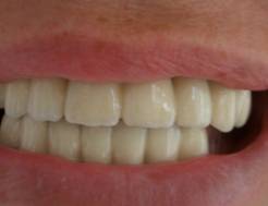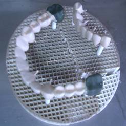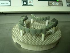 Dupa sablare se aplica prin pensulare stratul de bondig si se arde la 960ºC. Urmeaza aplicarea unui strat de opac al carui aspect sa fie cat mai aproape fata de culoarea aleasa si se arde la 930ºC (fig. 1, 2, 3). Dupa verificarea integritatii si uniformitatii opaquer-lui s-a efectuat prima ardere - de dentina (910º C);