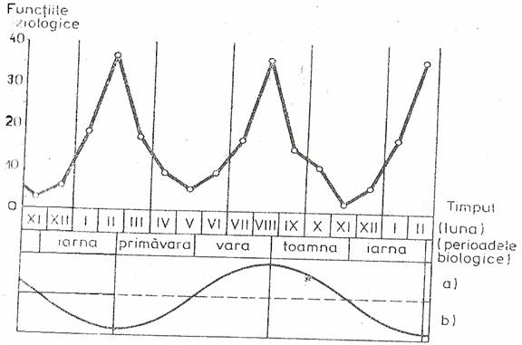 Ritmul biologic annual si perioada biologica anuala (dupa Hildebrandt).In partea superioara a schemei apare frecventa maxima si minima a 80 de functii fiziologice specifice .