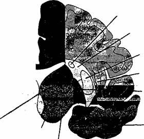 FIGURA 366-3 Diagrama unei emisfere cerebrale in sectiune frontala, in care sunt aratate teritoriile marilor vase cerebrale. (Prin amabilitatea lui C. M. Fisher, M. D.)
