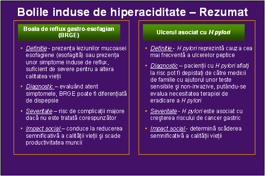 "Bolile induse de hiperaciditate" constituie un termen generic care cuprinde mai multe afectiuni, dintre care cele mai frecvente sunt BRGE si ulcerele determinate de H pylori.