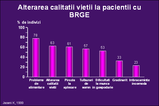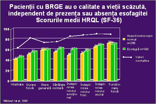 Pacientii cu simptome de reflux au o calitate a vietii alterata (HRQoL) comparativ cu populatia sanatoasa de referinta. Pacientii cu BRGE au vitalitate mai scazuta, se simt bolnavi, sufera de dureri si disconfort emotional, iar activitatile fizice si sociale sunt mai limitate decat in grupul de referinta.