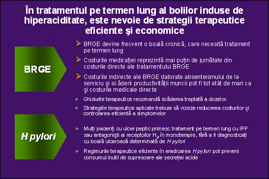 In ceea ce-i priveste pe pacientii cu boala ulceroasa determinata de H pylori, exista la ora actuala un numar mare de pacienti care primesc tratament pe termen lung cu inhibitori ai secretiei acide, desi numeroase dovezi arata ca eradicarea H pylori si vindecarea ulcerului sunt mai eficiente si au un raport cost-eficacitate mai avantajos comparativ cu monoterapia pe termen lung cu un inhibitor al secretiei acide.