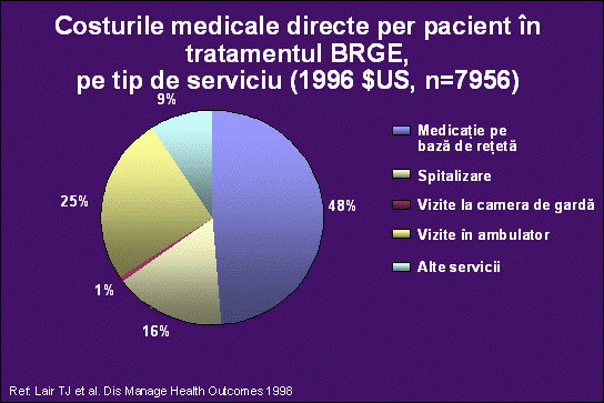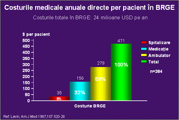 Conform acestui studiu costul mediu anual per pacient cu BRGE numai acele costuri ce pot fi atribuite in mod evident ingrijirii BRGE) a fost de USD Dupa cum se poate observa, costurile medicatiei antagonisti ai receptorilor H2, IPP, metoclopramid, cisaprid, misoprostol sau sucralfat) au fost relativ scazute reprezentand doar o treime din costurile totale