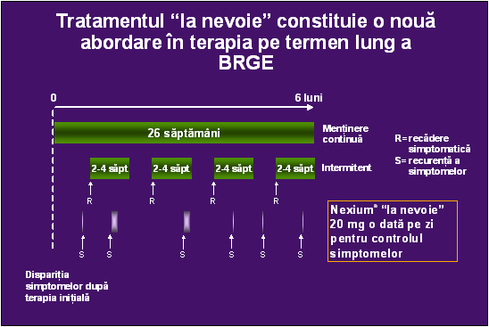 Prin urmare, devine evidenta nevoia unei strategii terapeutice eficiente si economice pe termen lung, de vreme ce aceasta nevoie nu este indeplinita de tratamentul continuu cu doze mici de IPP sau de regimurile intermitente: ambele abordari predispun pacientii la perioade prelungite de recaderi simptomatice Regimul de tratament "la nevoie", in care, la reaparitia simptomelor, pacientul isi administreaza o tableta zilnic pana la remiterea acestora, ar putea reprezenta o asemenea strategie, scutind totodata pacientul de necesitatea tratamentului zilnic