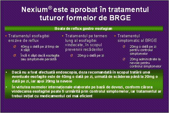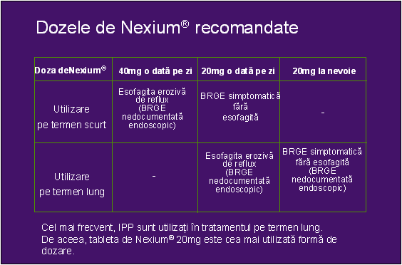 Nexium 20mg permite de asemenea o mai buna flexibilitate a tratamentului fata de omeprazol 20mg, atat in tratamentul initial, cat in cel pe termen lung, la pacientii cu BRGE simptomatica. Spre deosebire de omeprazol sau orice alt IPP, nu este nevoie de o durata fixa a tratamentului sau de o perioada initiala de tratament. La pacientii cu BRGE simptomatic care primesc Nexium, doza poate fi scazuta imediat ce simptomele au disparut Aceasta reduce consumul de medicament si numarul vizitelor la medic