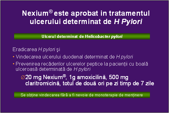 Nexium este aprobat pentru tratamentul ulcerului duodenal si eradicarea Helicobacter pylori in tripla terapie pentru o saptamana fara a mai necesita inca trei saptamani de monoterapie cu IPP.
