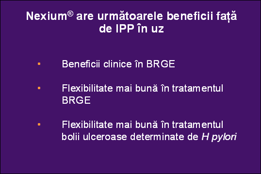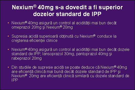 Controlul superior al secretiei acide cu Nexium comparativ cu omeprazol,pantoprazol,lansoprazol si rabeprazol conduce la o eficienta clinica mai mare si la un caracter mai predictibil al raspunsului, iar contolul valorilor pH-ului acrediteaza ideea unor beneficii clinice superioare altor IPP.
