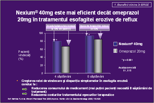 Aceste date provin din trei studii clinice care au comparat Nexium 40mg o data pe zi si omeprazol 20mg pe zi. Aceste studii au demonstrat ca Nexium 40mg este mai eficient decat standardul de aur, Losec. De aceea, Nexium 40mg ofera o rata superioara de vindecare fata de cea obtinuta cu dozele standard de IPP in uz In consecinta, Nexium poate reduce durata tratamentului la un numar semnificativ de pacienti De asemenea, numarul esecurilor terapeutice dupa saptamani de tratament este redus cu