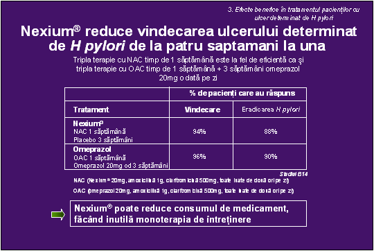 Acest studiu demonstreaza ca tripla terapie cu Nexium 20mg este cel putin la fel de eficienta ca tripla terapie standard cu Losec 20mg, amoxicilina si claritromicina, urmata de saptamani de monoterapie cu omeprazol 20mg o data pe zi, determinand aceleasi rate de vindecare a UD si eradicare a H pylori.