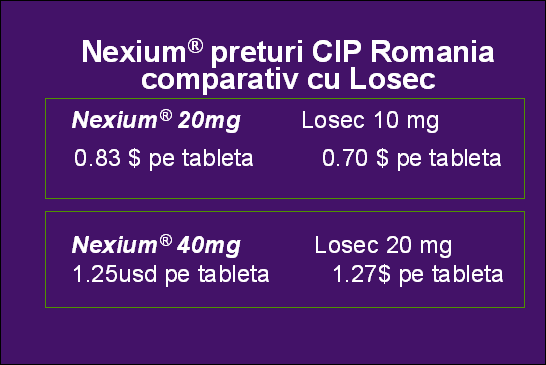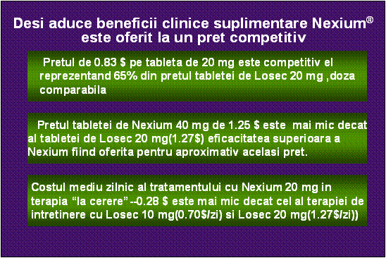 pretul tabletei de Nexium 20 mg este cu 35% mai mic decat al celei de Losec 20 mg. Utilizarea Nexium in tratamentul de intretinere va duce la o reducere a costurilor cu acelasi procent
