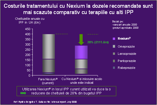 In partea dreapta sunt prezentate cheltuielile anuale prezise in cazul inlocuirii IPP in GERD conform indicatiilor, cu Nexium. Economiile care s-ar putea realiza ar fi de aproximativ 111 milioane £(