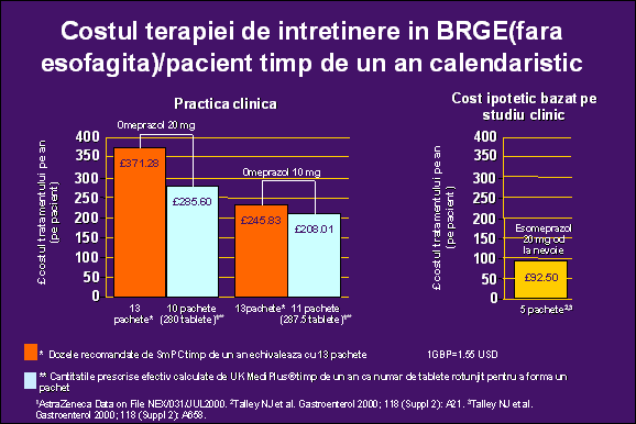 Avand in vedere caracterul cronic al BRGE care, de cele mai multe ori, necesita tratament pe termen lung este logic ca o atentie deosebita a fost acordata costurilor pe care trebuie sa le suporte pacientii pentru achizitia medicamentului Pentru sistemul de sanatate, este de asemenea important sa se inteleaga faptul ca medicatia costa mai putin de din costurile totale directe ale tratamentului Alte costuri medicale directe ale tratamentului bolilor induse de hipersecretia acida le depasesc pe cele aferente medicatiei BRGE scade de asemenea capacitatea de munca si productivitatea la lucru, iar costurile asociate acestora ar putea fi la fel de ridicate ca si cele aferente vizitelor, investigatiilor si medicamentelor