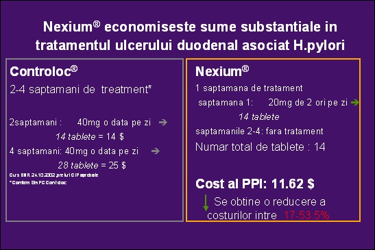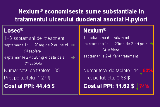 In concluzie Nexium vindeca ulcerul duodenal asociat H. pylori mai repede si la un pret mai redus comparativ cu Losec si Controloc.