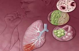 SIMPTOME-debutul este insidios,cu tuse,la inceput uscata,apoi cu expectoratie si dispnee de efort cu caracter expirator.Bronsitele repetate constitue prima manifestare clinica .In timp apar dispneea si respiratia suieratoare.