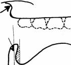 - Mucoasa pasiv mobila (fig. 5-10). La campul protetic mandibular limita de trecere de la mucoasa fixa la cea pasiv mobila si mobila, de cele mai multe ori nu este posibil sa fie localizata. Campul protetic mandibuIar desi este reprezentat de o suprafata foarte redusa, nu are nici o delimitare precisa. Acest camp protetic caracterizat de forma sa este delimitat vestibular si lingual, la nivelul celor doua funduri de sac, de zona de mucoasa neutra. La nivelul fundului de sac lingual identificarea acestei zone de mucoasa neutra este mai putin precisa. Delimitarea este obtinuta cu ajutorul materialelor speciale de amprentare functionala.
