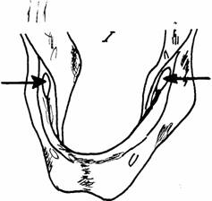 - Creasta alveolara la mandibula este foarte mult redusa, comparativ cu cea de la maxilar. Suprafata de sprijin este mai mica. Daca procesul de atrofie este foarte intins creasta este redusa, incat ea poate fi situata sub nivelul liniei oblice interne si externe. In zona distala creasta este limitata de tuberculul piriform si de insertia ligamentului pterigomandibular. Acest ligament are insertia in treimea posterioara a tuberculului piriform (Eg. 5-9).