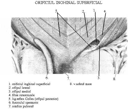 o intre cei doi stalpi se arcuiesc fibre aponevrotice denumite fibre intercrurale; acestea solidarizeaza stalpii delimitand supero-lateral orificiul inghinal superficial