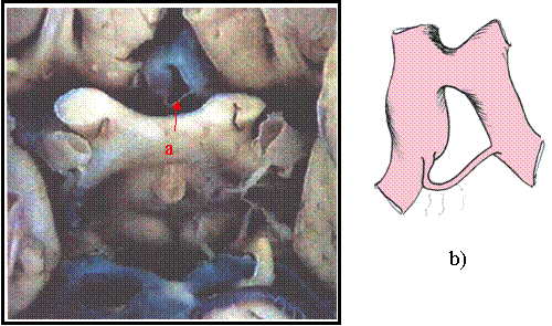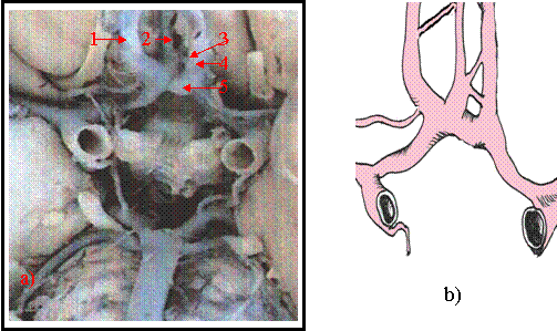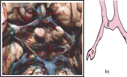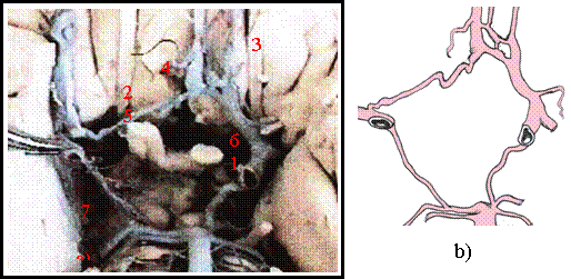 Figura 9.29 a) Poligonul lui Willis disecat pe baza encefalului in prealabil injectat si fixat in formol