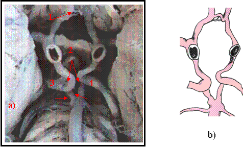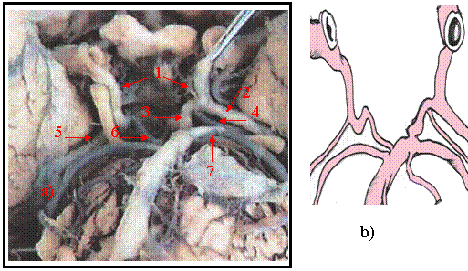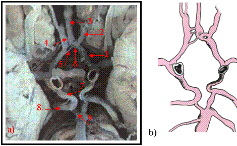 Figura 9.4 a) vasele poligonului lui Willis disecate pe encefal b) prezentare schematica