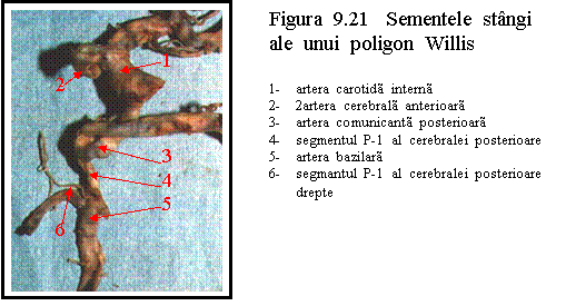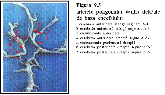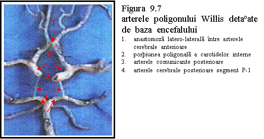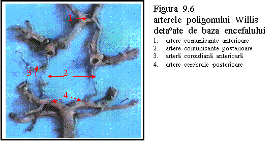 Figura 9.9 a) vasele poligonului Willis disecate pe encefal