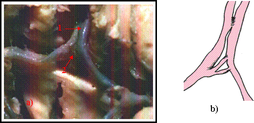 Figura 9.8 a) vasele poligonului Willis la baza encefalului injectate cu rosu de Congo si disecate